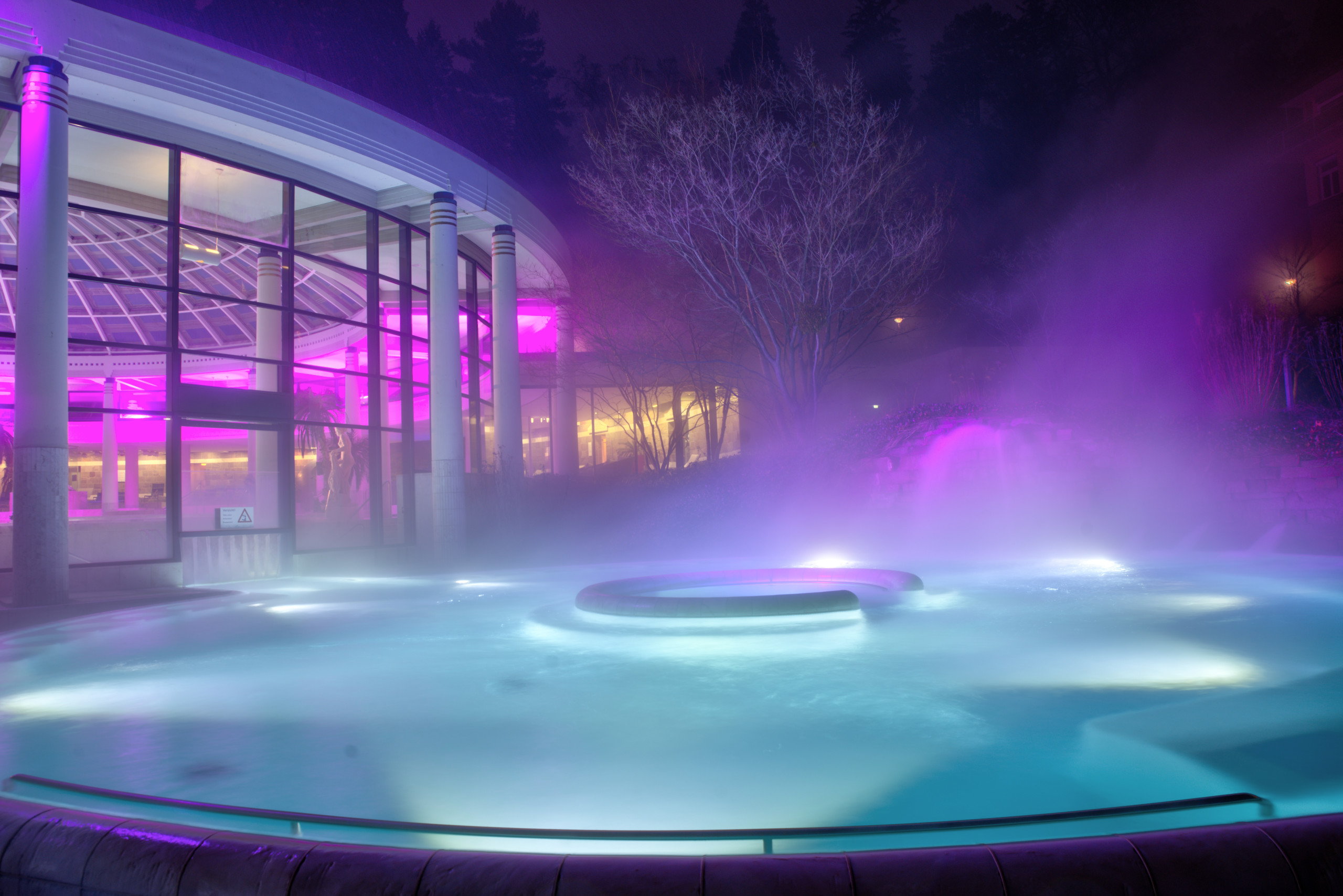 Plus tard, vous vous détendez dans la piscine extérieure tandis que la vapeur danse à la surface de l'eau et que les lumières de Baden-Baden scintillent en arrière-plan. Peut-être passerez-vous à l'un des bains à remous, vous laisserez-vous tenter par l'hydromassage et profiterez de la tranquillité qui recouvre votre journée comme une couverture.