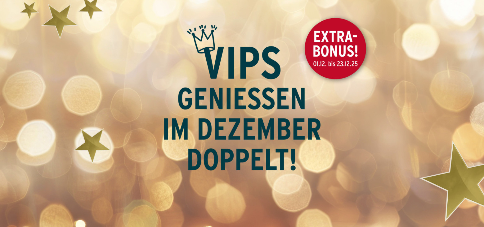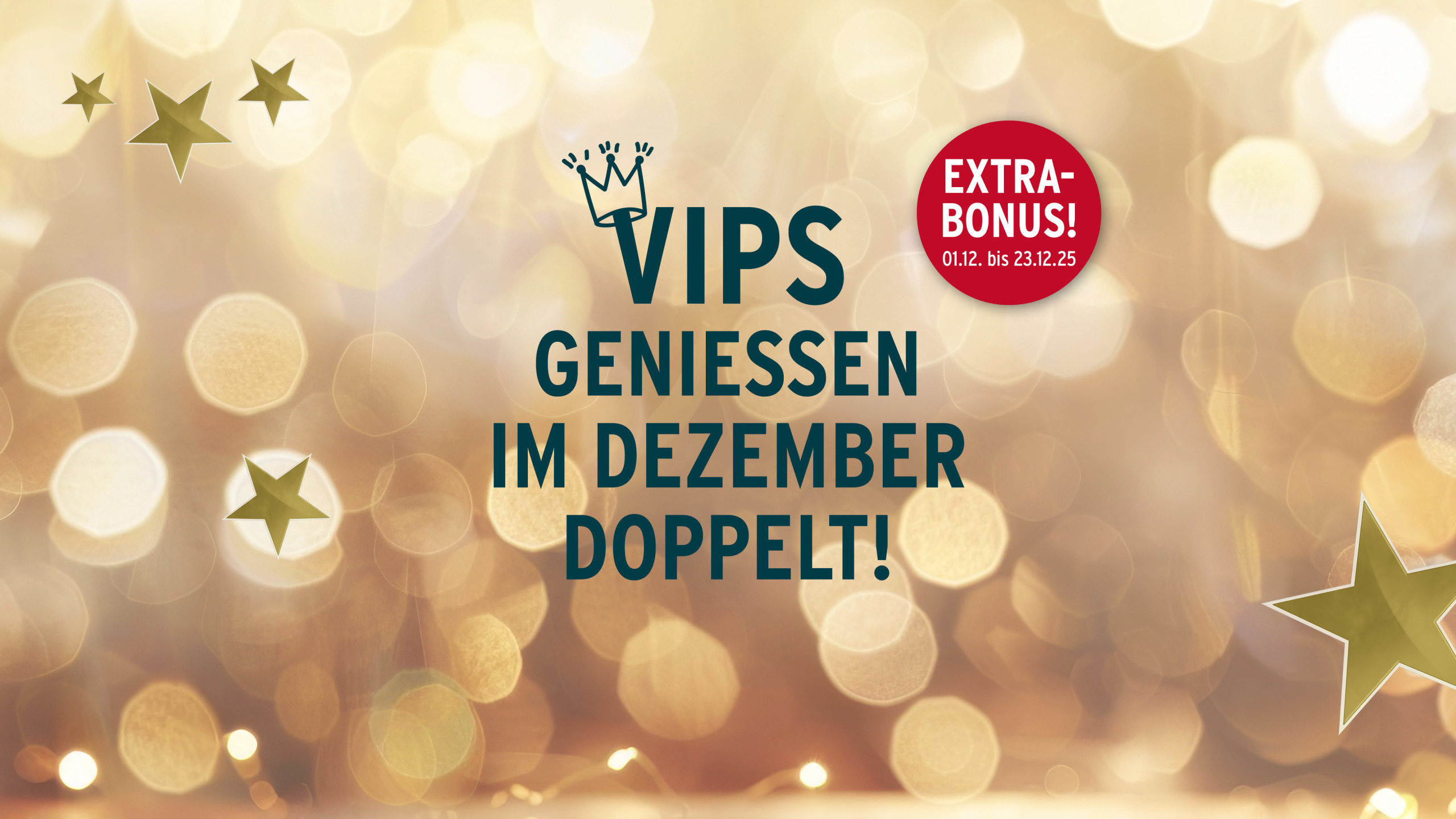 C'est enfin le moment : nos VIP profitent doublement en décembre ! En chargeant votre jeton VIP, vous vous assurez un crédit supplémentaire - en plus de votre remise VIP habituelle sur l'entrée aux Thermes de Caracalla et au Friedrichsbad.